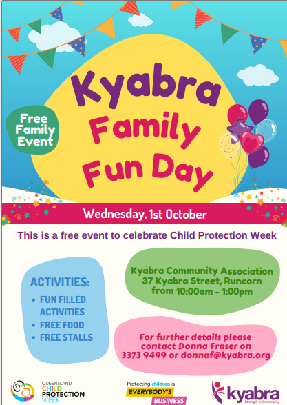 Kyabra Community Assocation 37 Kyabra Street, Brisbane, QLD, AustraliaKyabra will be holding a free family fun day for all families and community members to attend. The event will have staff holders from all over Brisbane and each will have a fun filled activity for the children to enjoy. Come along for a free sausage sizzle, carnival food, games, jumping castle and a reptile […]